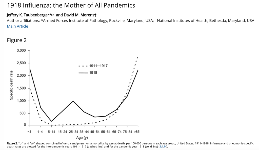A standard Influenza respiratory epidemic has a U-shaped death curve (see dotted line 1911-1917 curve below), meaning that you have very young and very old people dying. What happened in the 1918 Influenza pandemic is that they had a W-shaped curve (see solid line below). The peak in the middle happened to be people between the ages of 20 and 40.