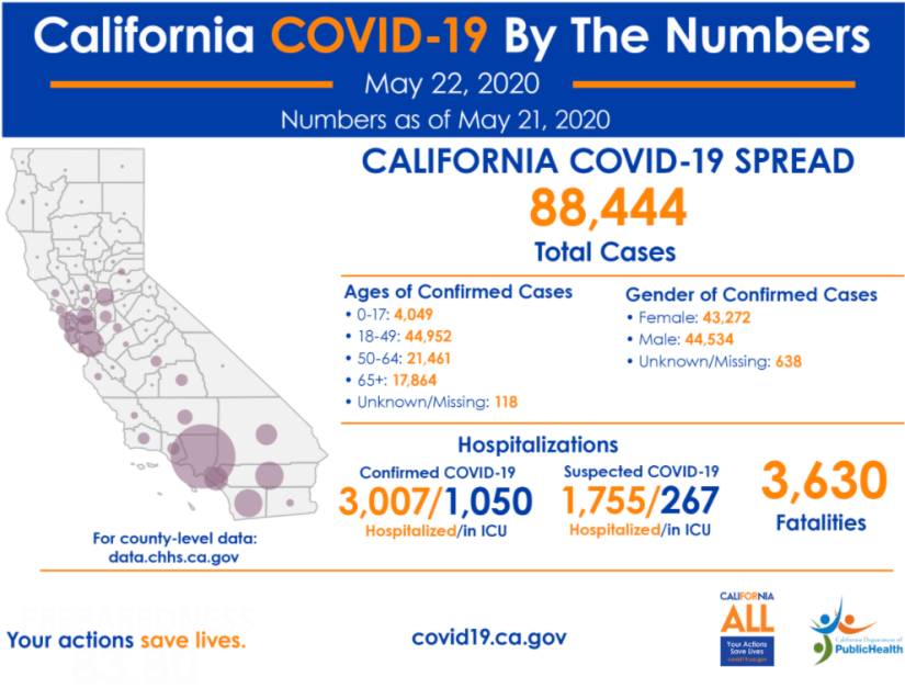 As of 5/21/20, the State of California has 88,488 total infections, 3,624 new infections, 3,624 total deaths and 110 new deaths. On 5/21/20, California had more new deaths than any other state, with the exception of New York and was 7th in total deaths in the United States, having just surpassed Connecticut’s deaths. On 5/21/20, California reported 4,735 hospitalized COVID-19 patients (on that day) and 1,310 patients in the ICU. If California were a country, it would rank 13th in total number of cases in the world (above China) and 17th in total deaths (between Russia and India). It would rank 10th in new deaths in the world on 5/21/20. It would rank 7th in the world in ICU patients (between Spain and the UK). As of 5/21/20, California reported conducting 1,421,127 COVID-19 tests, which represents 3.57% of California’s population of 39.78 million. However, we know that some people have been tested more than once, so in fact, less that 3.57% of the population has been tested for COVID-19.