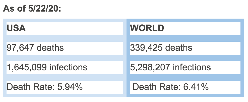 By our way of counting, this is Day 145 of the COVID-19 pandemic. To date, we have neither a vaccine nor a widely-available drug to effectively treat or prevent this infection. Our first USA case was identified in Washington State on Day 21 of the pandemic. In those next 124 days (17.7 weeks) the United States, as of 5/22/20, had 1,645,099 known COVID-19 PCR positive infected patients and 97,647 deaths, giving us a still rising death rate of 5.94%. We had 24,197 new cases and 17,109 people in serious or critical condition on that day. That was the fourth day in a row that we’ve had over 17,000 people in serious or critical condition in the United States. We have 1,314,204 more COVID-19 positive infected patients than any other country in the world. The five countries other than the US with the most cases (Brazil, Russia, Spain, the United Kingdom, and Italy) have a total of 1,422,095 cases combined, which is 223,004 fewer cases than in the United States.