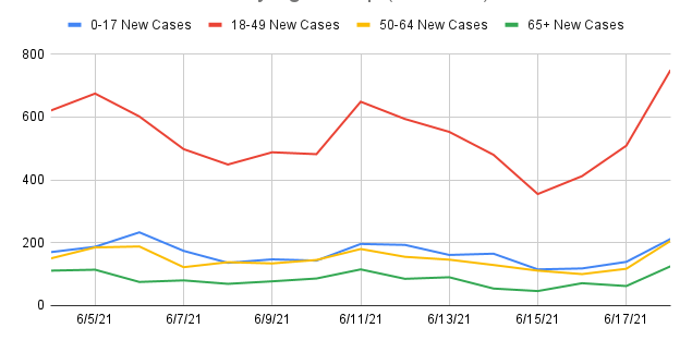 An examination of cases broken down by age group reveals that the 18-49 age group continues to have the highest rate of infection. There was a marked increase in new daily cases in this age group from June 15 to June 18, with moderate increases for the other three age groups.