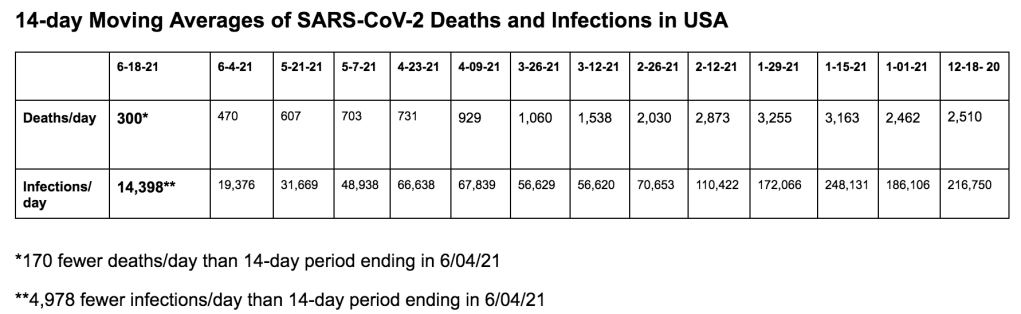 In the United States, SARS-CoV-2 deaths have decreased for the tenth time in a 14-day period. There were 170 fewer deaths per day than in the last 14-day period. In the last 14 days, the number of infections has decreased by 4,978 infections per day. Our infections per day are still high, probably secondary to SARS-CoV-2 mutants, to include the Alpha/B.1.1.7 isolate, the Iota/B.1.526 isolate, the Epsilon/B.1.427 + B.1.429 isolate, the Beta/B.1.351 isolate, the Gamma/P.1 and Zeta/P.2 isolates, and the new isolate, Deta/B.1.617+. I would predict that the opening of schools, places of worship, bars, restaurants, indoor dining and travel all will contribute to further spread of multiple SARS-CoV-2 mutants and rising numbers in infections, hospitalizations and deaths in the coming months. Increased traveling as well as summer vacations, and the July 4 holiday will all cause further increases. Vaccinations, increased mask usage and social distancing, which are a part of the Biden SARS-CoV-2 plan (day 150 of plan) will be necessary to stop spread of mutants and cause further reductions in infections, hospitalizations and deaths in the future. On 6/18/21, the United States had 13,389 new infections. There were also 393 deaths. The number of hospitalized patients is decreasing, but 4,160 patients are still seriously or critically ill. The number of critically ill patients has decreased by 1,378 in the last 14 days, while 4,200 new deaths occurred. The number of critically ill patients is decreasing for the fifth 14-day period, but a large number of patients are still dying each day (average 300/day).