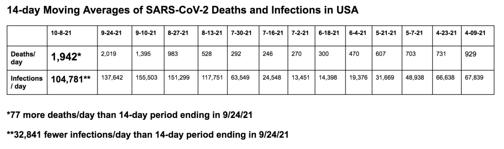 n the United States, SARS-CoV-2 deaths have decreased for the second time in seventeen 14-day periods. There were 282 fewer deaths per day than in the last 14-day period. In the last 14 days, the number of infections has decreased by 24,140 infections per day compared to the preceding 14-day period. Our infections per day have decreased for the third time over the last 14 weeks. This trend will continue. Increased vaccinations, increased mask usage and social distancing, which are a part of the Biden SARS-CoV-2 plan continue to stop the further spread of mutants and reduce infections, hospitalizations, and deaths. On 10/22/21, the United States had 82,483 new infections with one state failing to report (Iowa). There were also 1,610 deaths (with seven other states failing to report deaths). Florida continues to consistently under-report daily infections and deaths. The number of hospitalized patients is decreasing in many areas and only 14,232 patients are seriously or critically ill; that number was 17,497 two weeks ago. The number of critically ill patients has decreased by 3,265 in the last 14 days, while at least 23,244 new deaths occurred. The number of critically ill patients has decreased for the fourth time in eight 14-day periods but a large number of patients are still dying each day (average 1,660/day).