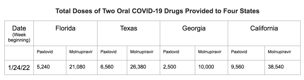 Merck has developed the oral drug Molnupiravir, which induces RNA mutagenesis by viral RNA-dependent RNA polymerase of SARS-CoV-2 and other viruses. According to Kabinger et al, “Viral RNA-dependent RNA polymerase uses the active form of Molnupiravir, β-D-N4-hydroxycytidine triphosphate, as a substrate instead of cytidine triphosphate or uridine triphosphate. When the RNA-dependent RNA polymerase uses the resulting RNA as a template, β-D-N4-hydroxycytidine triphosphate directs incorporation of either guanine or adenine, leading to mutated (viral) RNA products. Analysis of RNA-dependent RNA polymerase–RNA complexes that contain mutagenesis products has demonstrated that β-D-N4-hydroxycytidine (the active form of Molnupiravir) can form stable base pairs with either guanine or adenine in RNA-dependent RNA polymerase explaining how the polymerase escapes proofreading and synthesizes mutated RNA” (quotation modified for clarity). The results of the phase 3 trial of Molnupiravir were published in the NEJM article “Molnupiravir for Oral Treatment of Covid-19 in Nonhospitalized Patients” by Angélica Jayk Bernal, M.D. et al. (December 16, 2021 DOI: 10.1056/NEJMoa2116044). In this phase 3 study in the Molnupiravir group, 28 patients were hospitalized and one death occurred. In the placebo group, 53 patients were hospitalized and 9 died. Overall, 47% of hospitalizations and deaths were prevented by Molnupiravir. If you do a post hoc analysis and just look at deaths, Molnupiravir would prevent 89% of deaths. An Emergency Use Authorization by the FDA for Molnupiravir was approved on 12/24/21.The dose of Molnupiravir approved is four 200 mg capsules orally twice a day for five days. Diarrhea is reportedly a side effect in two percent of patients. I treated my first patient with Molnupiravir on 1/28/22. Currently more Molnupiravir is available weekly in the United States than PAXLOVID™ (see chart below; data from PHE.gov). Locally Molnupiravir is still available at CVS in Monterey (Fremont Blvd.; phone number: 831-375-5135) and CVS in Salinas (East Alisal Street; phone number 831-424-0026).