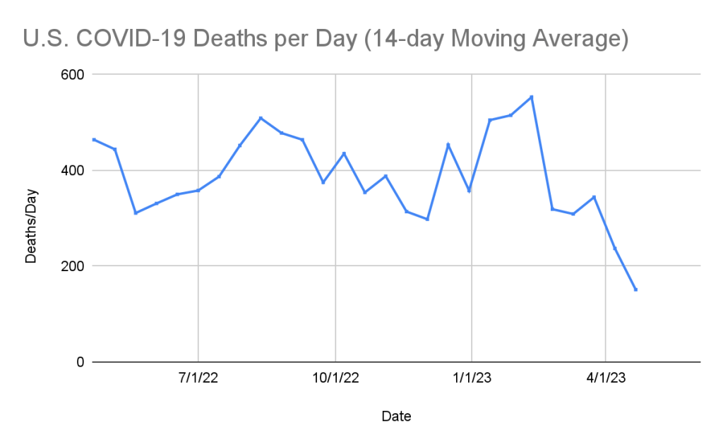 In the United States on 4/20/23 the number of hospitalized patients (4,778) had decreased (-13% compared to the previous 14 days). On 4/21/23 1,473 patients were seriously or critically ill. Patients are still dying each day (average 152/day, the last 14 days).
