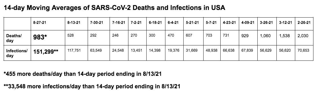 It’s time for our next 14-day moving average determinations for SARS-CoV-2 for the United States and my thoughts on vaccines, SARS-CoV-2 therapeutic agents and mutant viruses. We use the WORLDOMETERS aggregators data set to make any projections since it includes data from the Department of Veterans Affairs, the U.S. Military, federal prisons and the Navajo Nation.